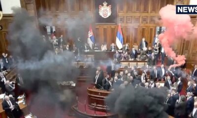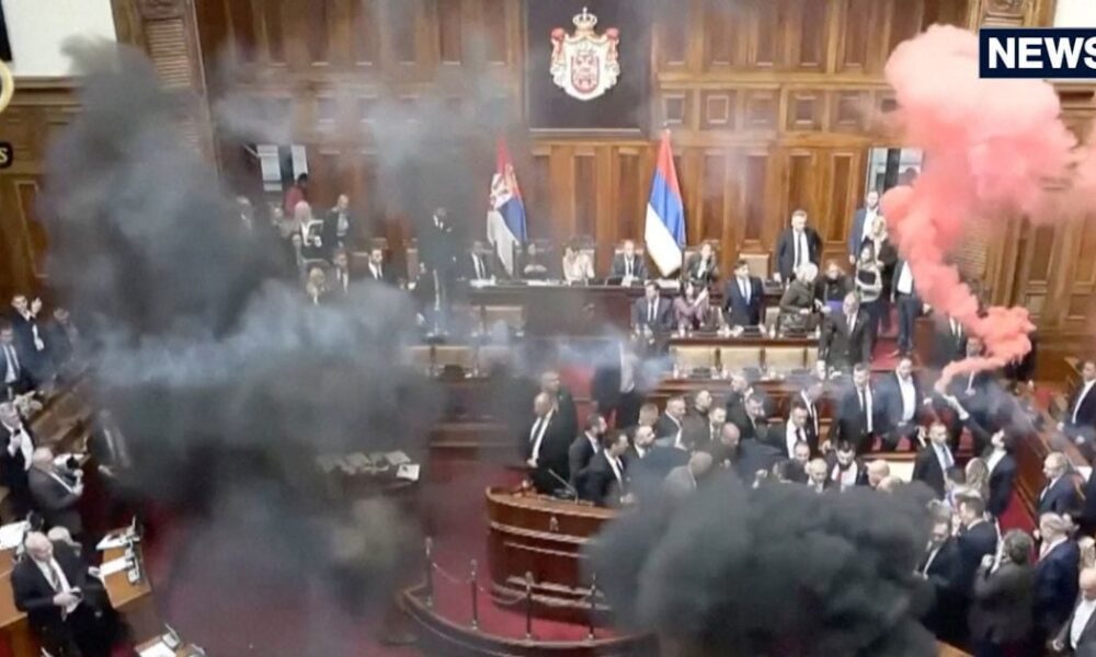 Last Updated:March 04, 2025, 17:59 IST सर्बिया की संसद में विपक्षी सांसदों ने स्मोग बम और आंसू गैस के गोले फेंके, जिससे काला और गुलाबी धुआं...